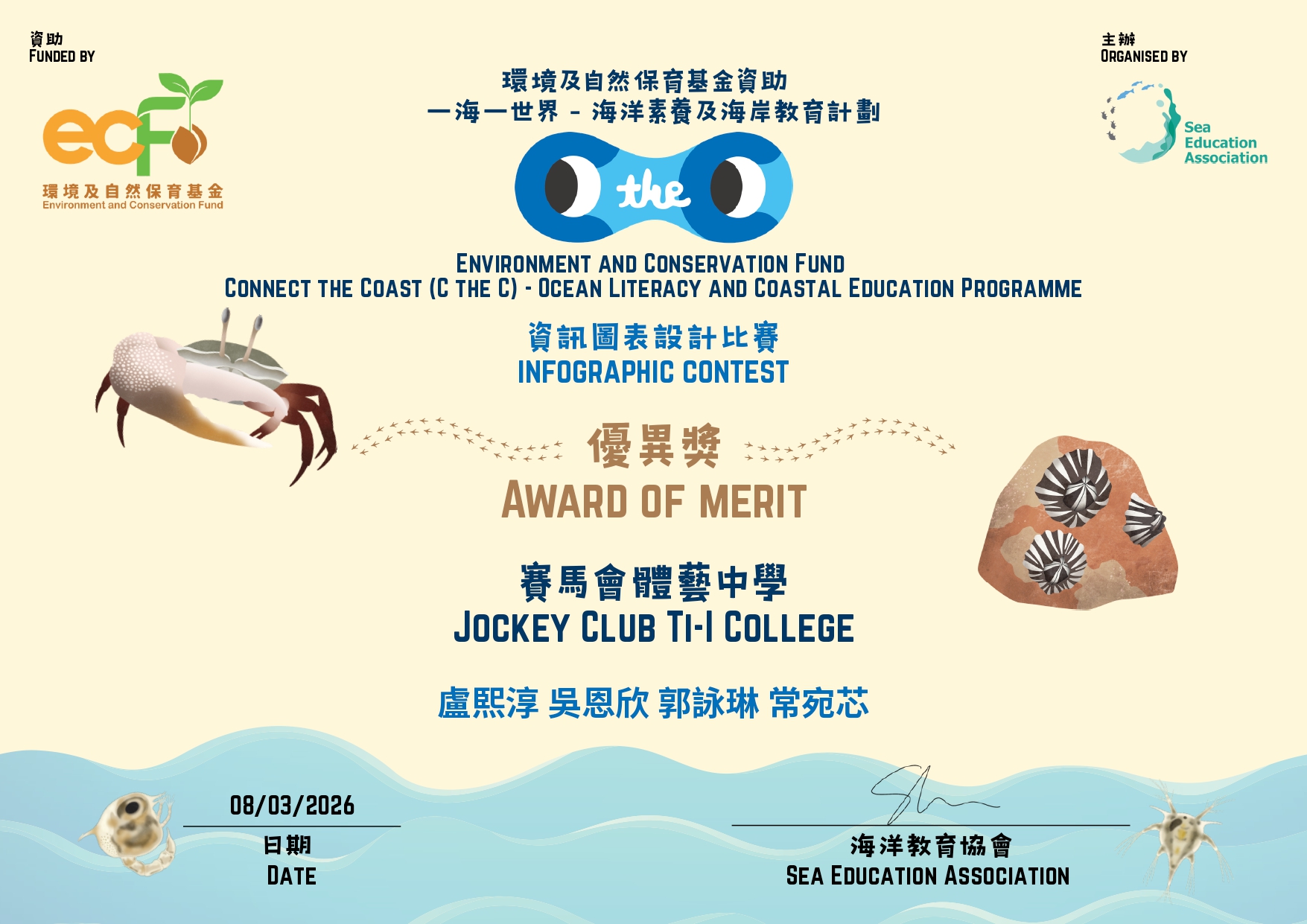 Congratulations to our Form 4 students—4A SHEUNG Yuen Sum, 4B NG Yan Yan, 4C KWOK Wing Lam, and 4D LO Hei Shun—for winning the Award of Merit in the "Connect the Coast - Ocean Literacy and Coastal Education Programme Infographic Contest"!